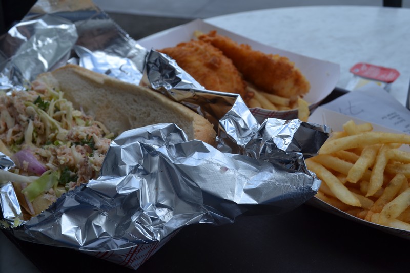 Puis nous nous posons dans un restaurant de fruits de mer populaire où nous dégustons en terrasse un sandwich au crabe, spécialité de la maison et un classique Fish and Chips tout en observant les mouettes qui déambulent sur les quais et la petite île où se trouve la célèbre prison d’Alcatraz.
