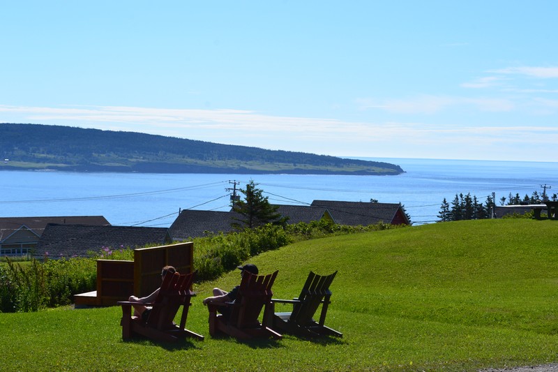 Après avoir réservé nos deux prochaines nuits nous arrangeons avec la réceptionniste une croisière en mer pour voir les baleines. Doris, la propriétaire appelle donc la compagnie et prend rendez-vous pour nous le lendemain à 9h00. Affaire rondement menée ! Alors que nous lui demandons quelques précisions sur le lieu et les possibilités de parking, Doris nous fait une réponse que ni l’un ni l’autre ne parvenons à décrypter. Il nous faut encore un peu de temps pour nous habituer à l’accent. Finalement, elle nous embarque dans sa voiture pour, nous pensons, choisir nos emplacements mais nous prenons en fait la route. Nous comprenons donc qu’elle nous amène en centre-ville et nous montre effectivement bientôt, où se situe la compagnie, le quai et où se garer. Vraiment adorable cette Doris ! Nous rentrons finalement pour choisir cette fois-ci nos emplacements. Le magnifique camping situé de l’autre côté de la route, offre une vue incroyable sur la baie et le rocher percé de Percé... Les emplacements des tentes sont supers. Nichés dans une épaisse petite forêt, ils offrent une végétation et une intimité qui ferait presque oublier que l’on est en camping. Après nous avoir indiqué les emplacements de libres, Doris nous fait visiter les parties communes : des sanitaires propres et à la décoration colorée, un grand salon avec télé, fauteuils, tables et chaises et de jolis abris en bois pour pouvoir pique-niquer même sous la pluie. La lumière du jour se fait de plus en plus rare et nous devons encore monter les tentes et préparer le repas.