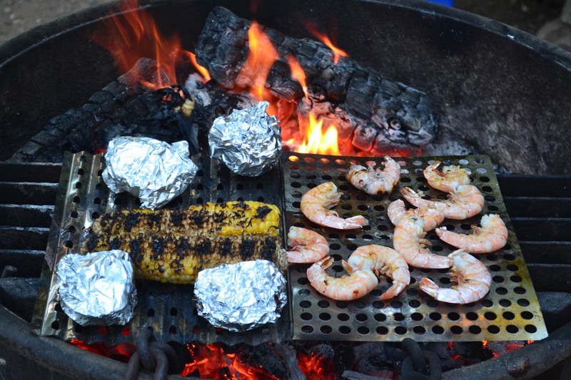 Il nous reste pas mal de bois et de charbon accumulés durant toutes nos vacances et nous en profitons pour faire un gros feu pour cette dernière soirée. Au menu, ce soir ça sera donc crevettes en apéro, et pour ne pas changer saucisses et maïs. Nous avons adopté la tradition du barbecue bière, saucisses et maïs en épi qu’on fait griller. Nous nous concoctons donc un bon repas le tout arrosé d’une bouteille de Sangiovese achetée au domaine dans l’après-midi.