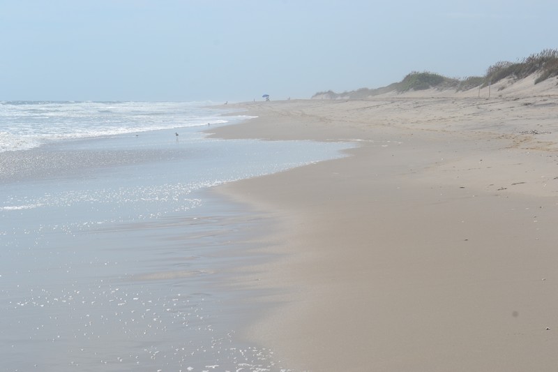 Nathan décide d’aller piquer une tête pendant que nous émergeons lentement puis, après le petit déjeuner, nous partons ensemble découvrir la plage qui s’étend sur des kilomètres derrière de hautes dunes à 2 minutes de notre campement. L’endroit est désert, en dehors de nos voisins de camping, qui, installés sur leurs chaises pliables, observent l’immensité de l’océan sous la belle lumière matinale. Ils nous disent avoir vu des requins nager à quelques mètres du bord. Cela ne nous surprend pas tant que ça, car il y a eu plusieurs attaques sur les plages de Caroline du Nord cet été, mais, sachant que Nathan avait nagé à cet endroit un moment plus tôt, cela nous fait un drôle d’effet !!! Mais finalement nous ne saurons jamais s’il s’agissait vraiment de requins ou peut-être d’une autre espèce marine.
