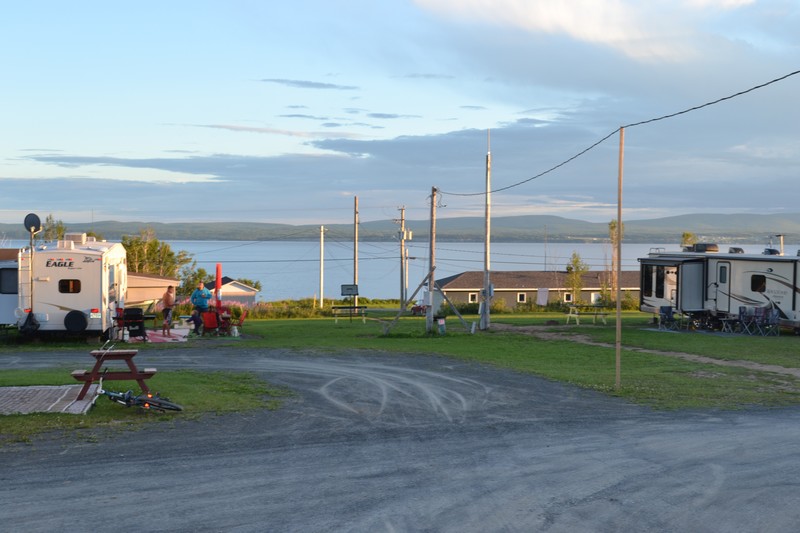 Nous nous renseignons dans un premier camping, les 4 Vents, conseillé par le guide, qui nous propose un tarif de près de 50 dollars par nuit, ce qui nous semble assez excessif pour un camping plutôt banal. Nous passons donc notre chemin et trouvons un peu plus loin le camping Baie de Gaspé. Le propriétaire très sympathique nous indique un tarif de 23 dollars et nous invite à choisir notre emplacement parmi ceux de libres. Nous passons devant les sites des caravanes et nous montons dans une partie plus ombragée du site où nous trouvons de jolis emplacements boisés. Le camping n’a pas le même charme que notre précédent à Percé mais jouit aussi d’une vue sur l’océan et est très agréable. Seul bémol, les sanitaires. Pas de douche dans le bloc à côté des sites de tentes et celles au niveau en dessous sont payantes. Il faut donc redescendre tout en bas dans un bloc tout neuf mais pas des mieux aménagé. Pour l’heure, nous plantons la tente et partons pique-niquer sur une jolie plage du parc.