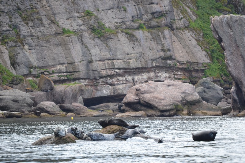 Puis, nous nous rendons dans les locaux de la compagnie où l’on nous remet notre équipement : combinaison de plongée, masques, tubas, gants, cagoules, palmes. La totale ! Une fois équipés, presque plus aucune partie de notre peau n’est pas recouverte. Cela dit, tant mieux ! l’eau n’a pas l’air des plus chaude. Nous attendons les retardataires et une fois tout le monde prêt, nous nous dirigeons sur le quai où bientôt un petit zodiac nous embarque. Nous n’allons pas bien loin en réalité. En une dizaine de minutes, nous arrivons sur une petite plage où de nombreux phoques se reposent. Nous ne pourrons pas nous en approcher trop en nageant car nous risquons de leur faire peur et ils se remettraient immédiatement à l’eau, ce qui est très mauvais pour eux car, en dehors de la grosse frayeur qu’ils auraient, ils ont vraiment besoin de se reposer.
