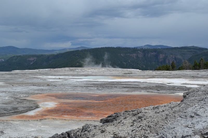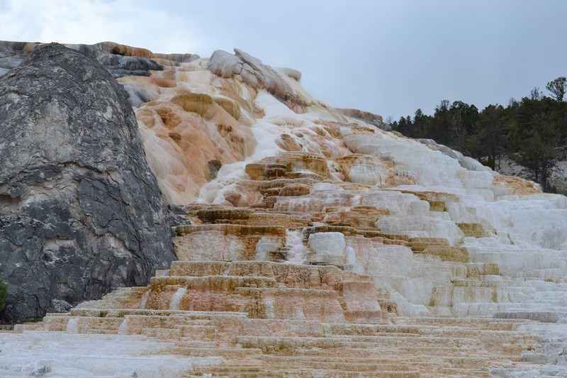 Le déjeuner terminé, nous repartons nous promener. Ici, ce sont des terrasses que nous admirons. Les bactéries qui s’y développent créent des coulées jaunes-orangées sur les paliers blanc-neige des concrétions de calcaire. Le site qui est plus petit que Norris Bassin se visite aussi sur une promenade aménagée qui rend la balade accessible à tout le monde. Nous ne sommes d’ailleurs pas seuls à venir admirer cet incroyable paysage.