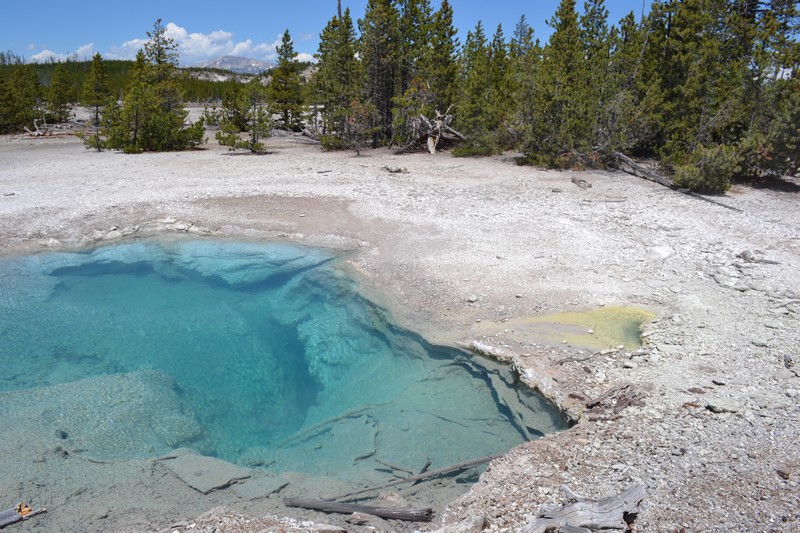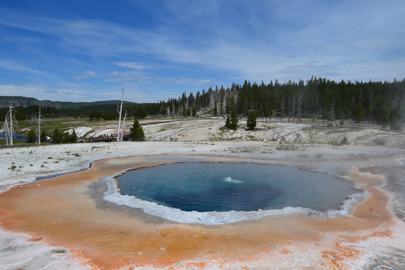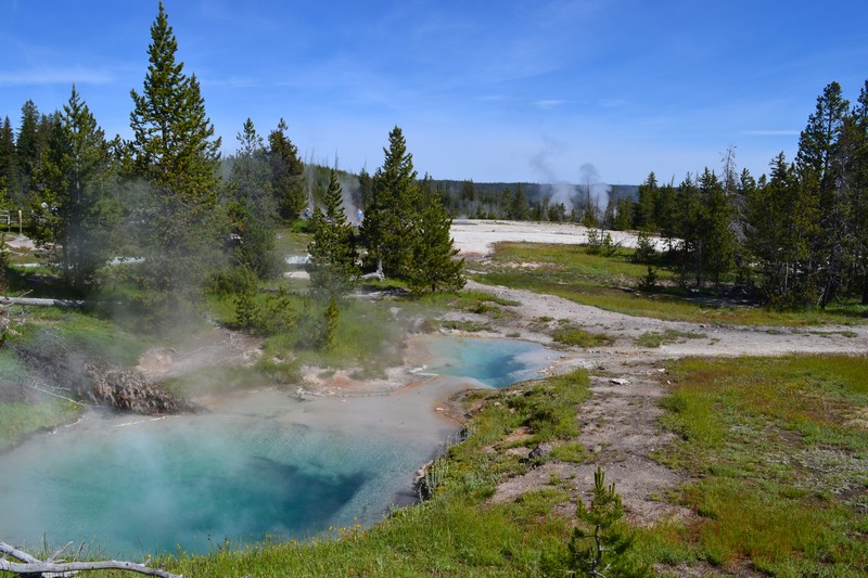 Après avoir installé notre tente, nous commençons notre visite du parc par le Norris Bassin. L’une des principales concentrations de piscines et de sources d’eaux chaudes du parc.